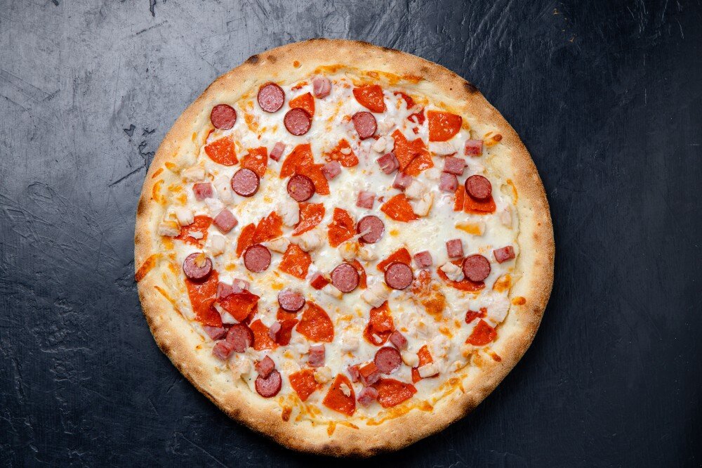 Томатный соус, моцарелла, ветчина из говядины, пепперони из говядины, курица копченая, охотничьи колбаски из говядины (21 см/30 см)