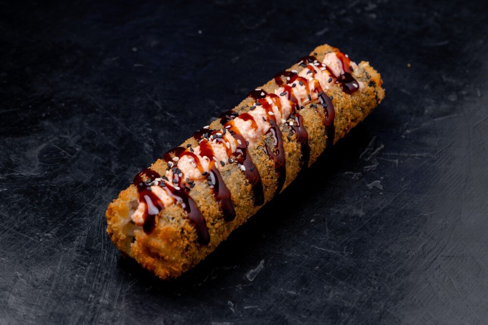 Рис, нори, сыр сremette, копченая курица в спайси соусе, панировочные сухари, соус унаги, кунжут