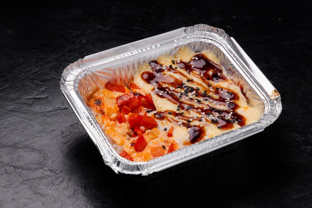 Рис, Лосось, Помидоры, Соус унаги, Соус спайси, Соус сливочный, Моцарелла, Кунжут