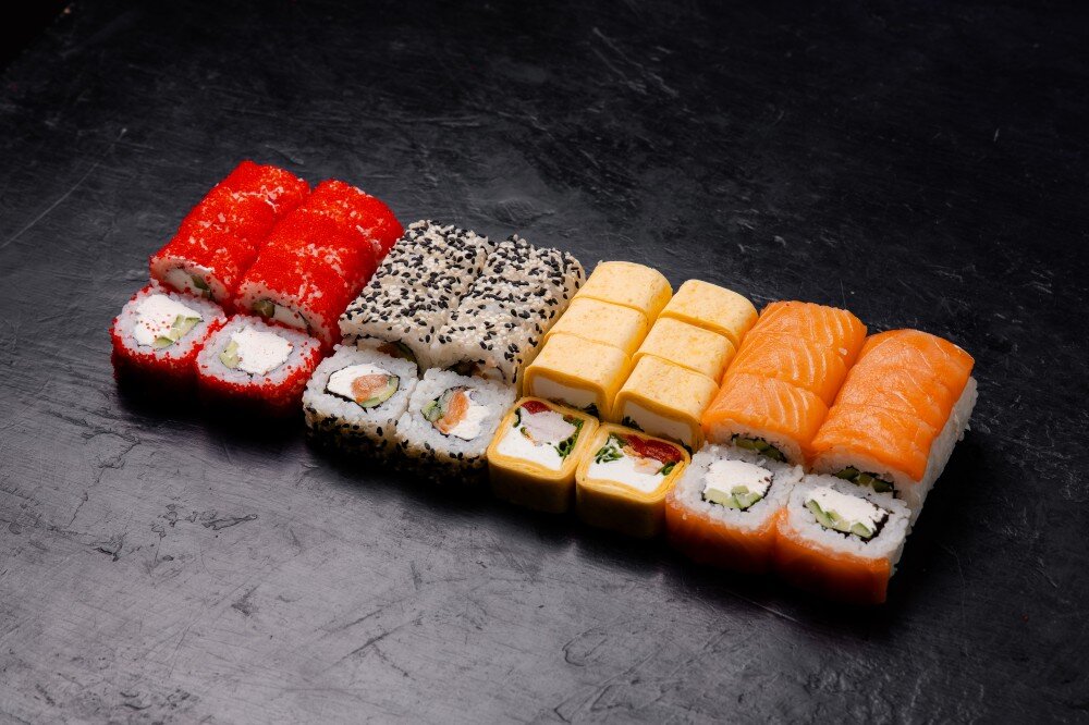 Филадельфия Лайт (8 шт.), Калифорния Лайт (8 шт.). Тортилья с курицей (8 шт.). Филадельфия в кунжуте (8 шт.), соевый соус (2 шт.), имбирь (2 шт.), васаби (2 шт.)