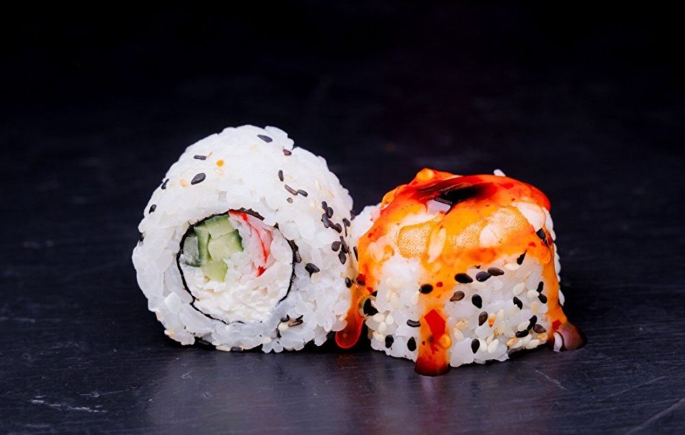 Креветка тигровая, крабовое мясо, сыр сremette, огурец, соус унаги, соус сладкий чили, кунжут