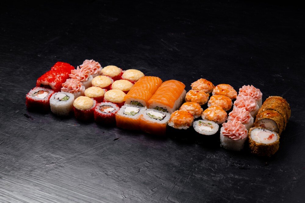Монако (8 шт.), Сарада (8 шт.), Лава-краб (8 шт.), Филадельфия Лайт (8 шт.), Калифорния с лососем (4 шт.), Уширу (4 шт.), соевый соус (3 шт.), имбирь (3 шт.), васаби (3 шт.)