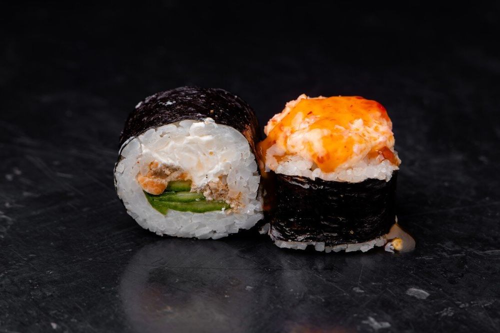 Рис, нори, жареный лосось, сыр сremette, огурец, соус крабовый, соус сладкий чили
